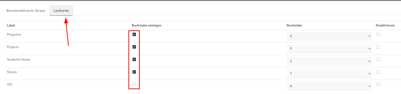 bei den Laufwerken, die per GPP eingebunden werden, kannst du in der WebUI unter Client-Konfiguration > Laufwerke den Haken bei „Buchstabe anzweigen“ entfernen, dann werden die Buchstaben nicht mehr gesetzt: