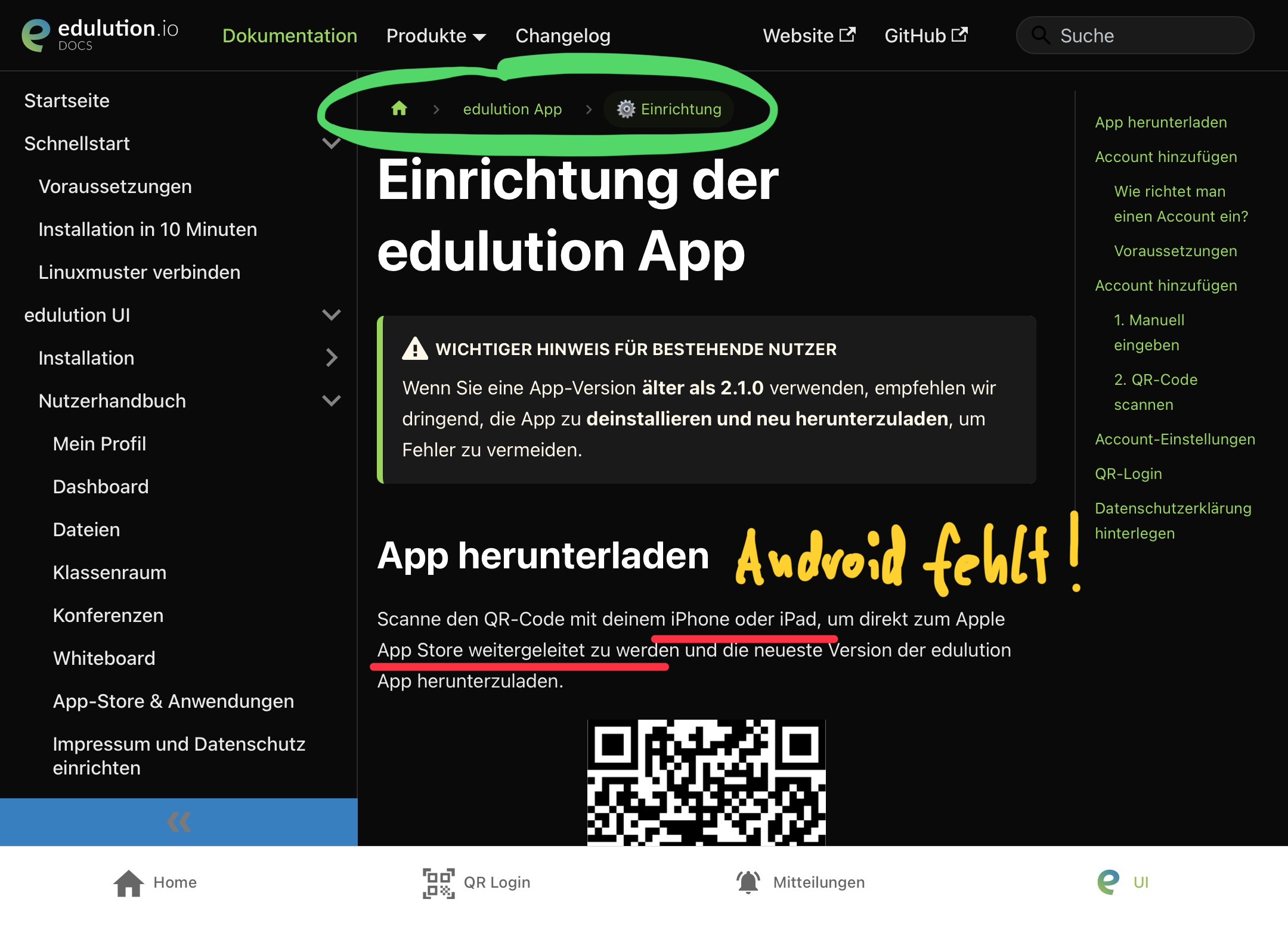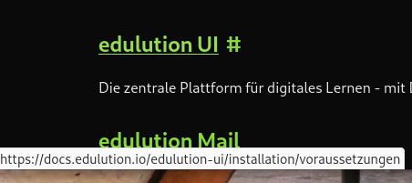 Wenn ich über die Hauptseite (https://docs.edulution.io/) und dann auf „Zur Dokumentation“ gehe, funktionieren die Links im Hauptpanel nicht. Die Links am linken Rand gehen.