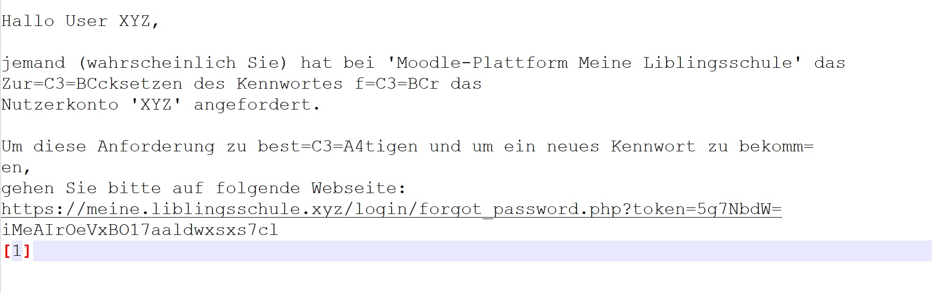 - … jemand (wahrscheinlich Sie) hat bei ‚Moodle-Plattform Blabla‘ das Zur=C3=BCcksetzen des Kennwortes f=C3=BCr das Nutzerkonto ‚XYZ‘ angefordert*