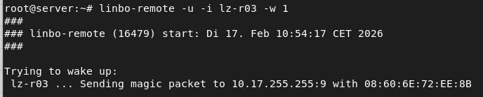 Dann habe ich vom server aus mit linbo-remote -i lz-r99 -w 1 nochmal ein WOL-Paket abgeschickt. Das Ergebnis beim Client sind die Zeilen 2 bis 6?