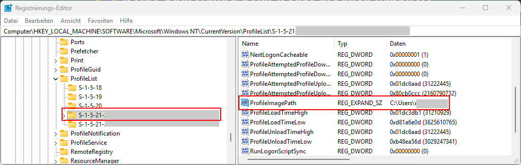 Es genügt nicht unter C:\Benutzer\<username> das Verzeichnis zu löschen. Es muss auch der zugehörige Registry-Schlüssel unterhalb von Computer\HKEY_LOCAL_MACHINE\SOFTWARE\Microsoft\Windows NT\CurrentVersion\ProfileList\ (links im Screenshot) entfernt werden, dessen Registry-Wert für ProfileImagePath auf das Nutzerprofil zeigt: