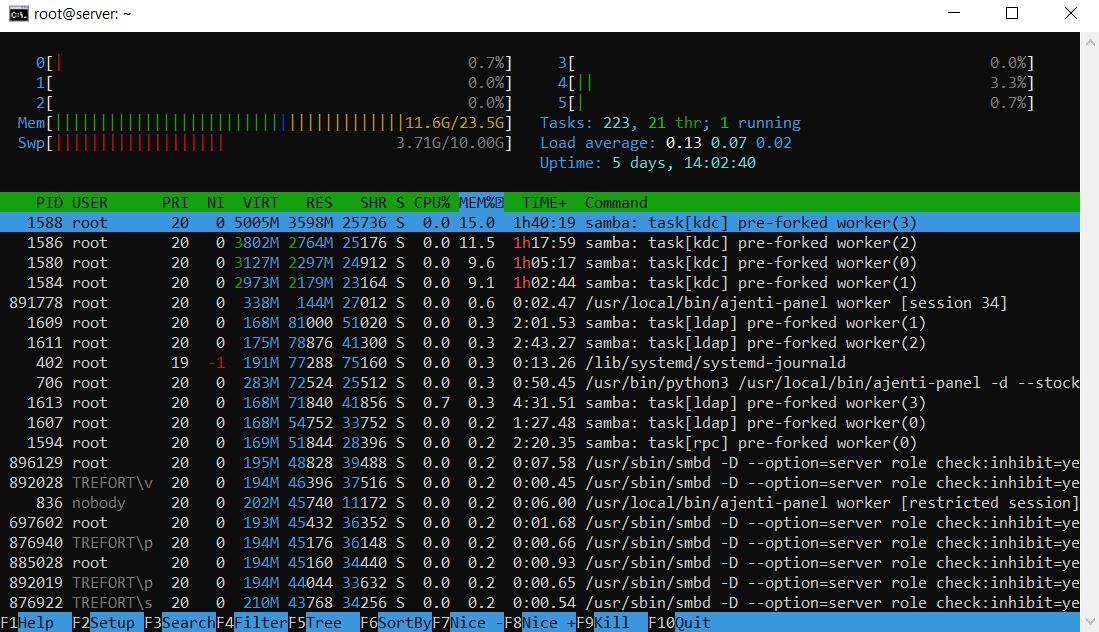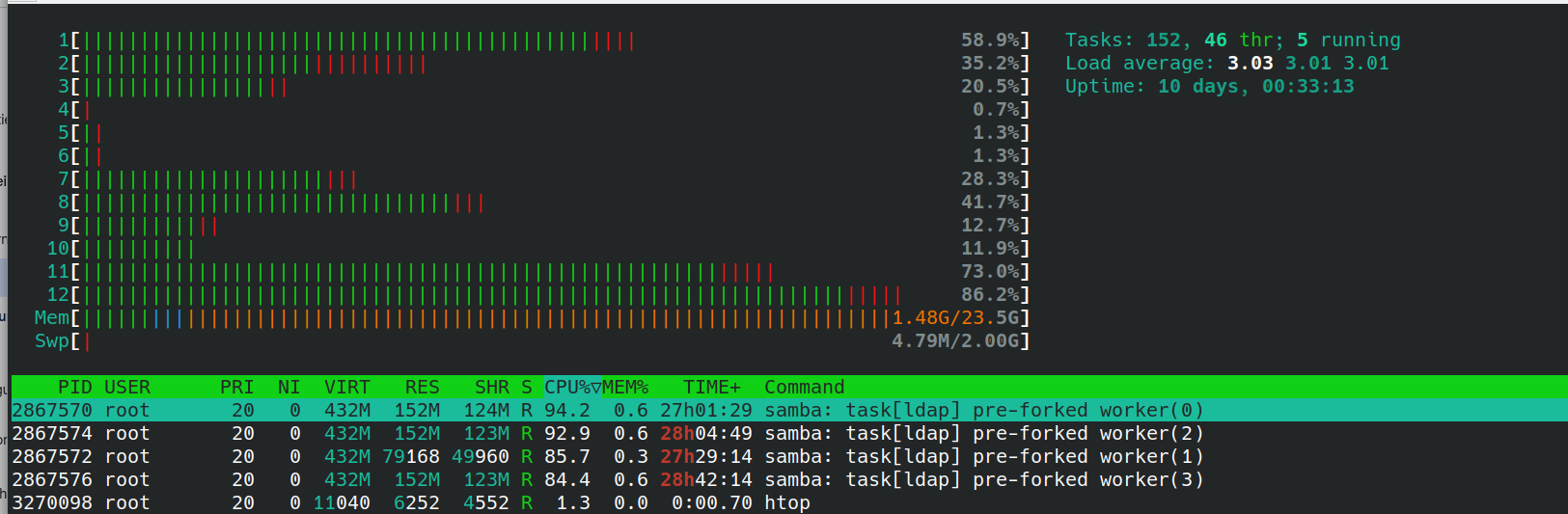 Meanwhile, I was looking at this smbd memory leak today (without too much traffic), and in one day, the freshly restarted samba grew from 200 MB to 7.3 GB. If it runs smoothly for several days, it can even eat up all the memory, so it’s quite a serious regression from 2:4.15. With version 13+dfsg-0ubuntu1.8, let’s hope the 1.9 patch comes quickly. Until then, if you haven’t updated from 1.6, don’t do it…