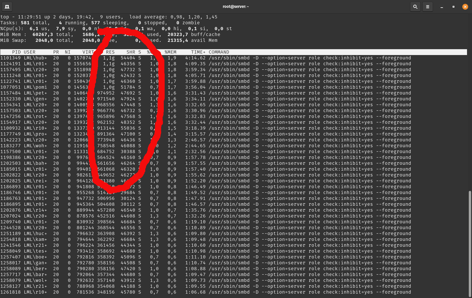 Bei Dir sind die smbd-Prozesse ja noch im Rahmen.