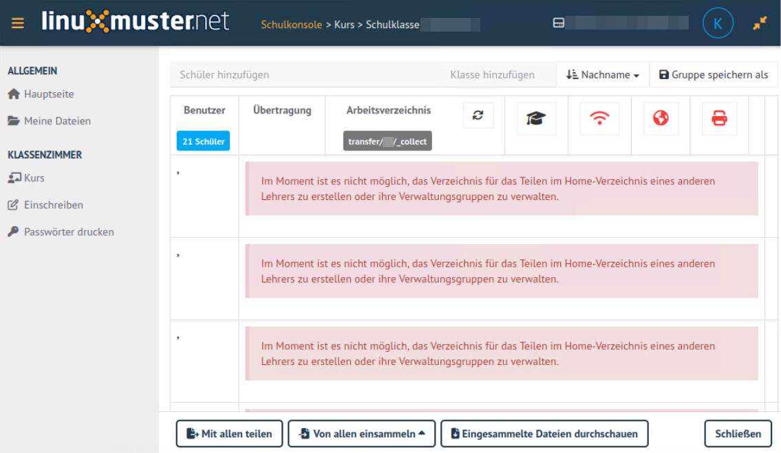 Im Moment ist es nicht möglich, das Verzeichnis für das Teilen im Home-Verzeichnis eines anderen Lehrers zu erstellen oder ihre Verwaltungsgruppen zu verwalten.