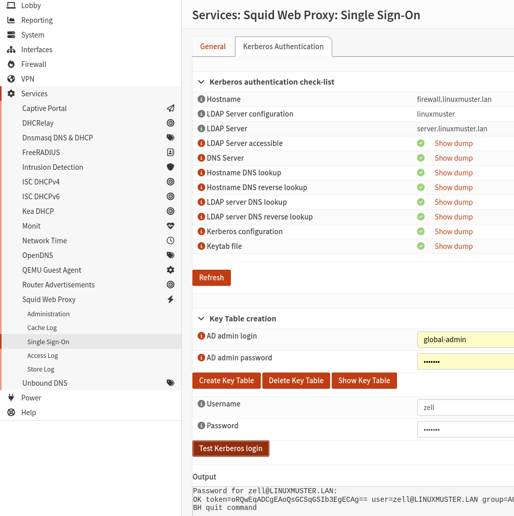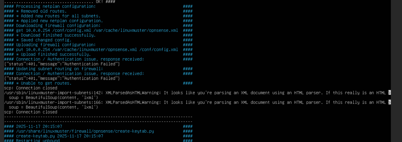 Das Setup scheint das wenig zu interessieren und behauptet es konnte erfolgreich eine verbindung aufbauen und führt die letzen aufgaben durch, die firewall ist weder pingbar vom server und das WAN interface ist auch down. Wenn ich die Interfaces von Hand setze und die IP Adressen wieder korrekt einstelle wurden auch alle wichtigen Dinge korrekt eingestellt also die Firewall Regeln sind alle da auch die no_proxy Group und SSO ist auch soweit alles grün nur die keytab datei existiert nicht (die wird ja erst nach dem neustart gesetzt) aber da ist die firewall ja schon kaputt.