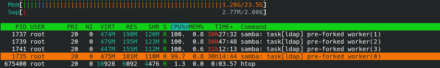 Unser lmn Server (AD/DC-Controller) hat 16 vCPU und 64 GiB RAM. Das sollte eigentlich mehr als ausreichend sein. Die gesamte CPU-Last übersteigt laut Proxmox auch im Maximum nie den Wert von 30%. Mittels htop sieht man aber, dass der Samba-Prozess die meiste CPU-Zeit frisst.